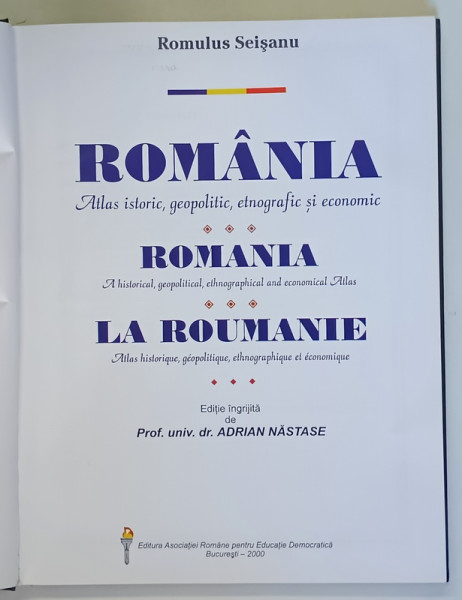 ROMANIA . ATLAS ISTORIC , GEOPOLITIC , ETNOGRAFIC SI ECONOMIC de ROMULUS SEISANU , 2000 * MICI DEFECTE COPERTA