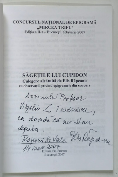 SAGETILE LUI CUPIDON , CULEGERE ALCATUITA de ELIS RAPEANU CU OBSERVATII PRIVIND EPIGRAMELE DIN CONCURS , EDITIA A II - A , 2007 *DEDICATIE