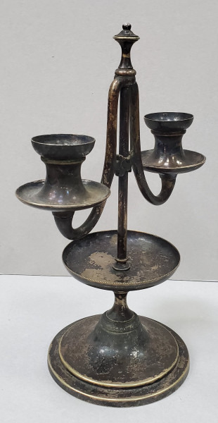 Sfesnic din metal argintat cu doua lumini. H = 24 cm