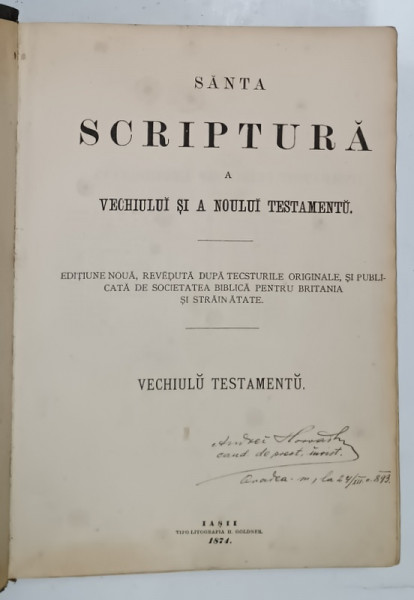 Sfânta Scriptură a Vechiului şi a Noului Testament - ediţie revizuită de Societatea biblică pentru Britania şi străinătate, Iaşi, 1874.