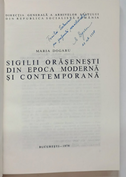 SIGILII ORASENESTI DIN EPOCA MODERNA SI CONTEMPORANA de MARIA DOGARU , 1978 *DEDICATIE