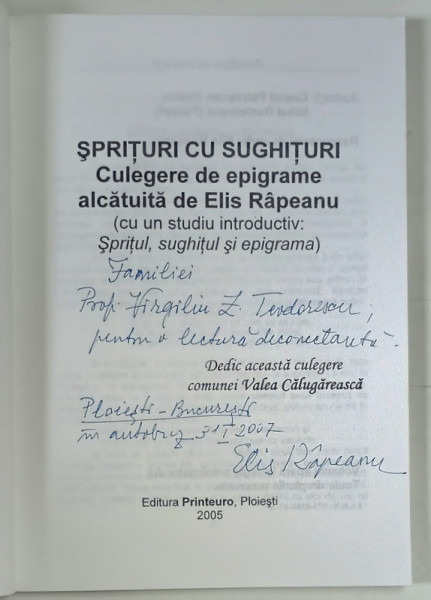 SPRITURI CU SUGHITURI , CULEGERE DE EPIGRAME , alcatuita de ELIS RAPEANU , 2005 *DEDICATIE