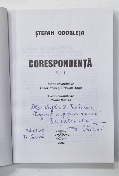 STEFAN ODOBLEJA , CORESPONDENTA , VOLUMUL I , editie alcatuita de TUDOR RATOI si CRISTIAN ANITA , 2002 , DEDICATIE *