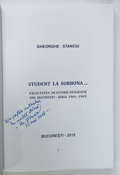 STUDENT LA SORBONA ....FACULTATEA DE ISTORIE - GEOGRAFIE DIN BUCURESTI - SERIA 1966 -1969 de GHEORGHE STANCIU , 2018, DEDICATIE *