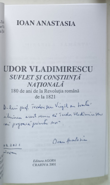 TUDOR VLADIMIRESCU , SUFLET SI CONSTIINTA NATIONALA , 180 DE ANI DE LA REVOLUTIA ROMANA DE LA 1821 de IOAN ANASTASIA , 2001 *DEDICATIE