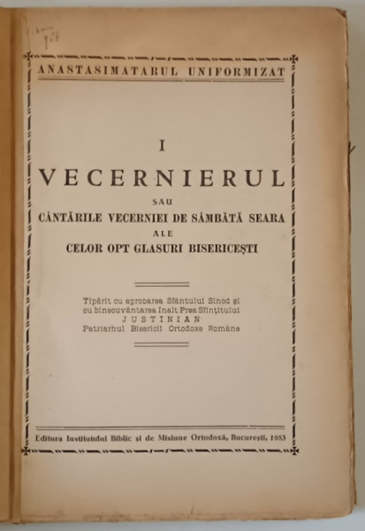 VECERNIERUL TIPARIT CU APROBAREA SFANTULUI SINOD SI CU BINECUVANTAREA PATRIARHULUI JUSTINIAN (1953)