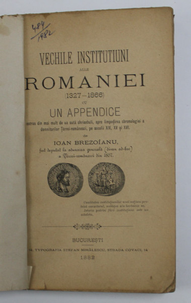 VECHILE INSTITUTIUNI ALLE ROMANIEI (1327-1886) CU UN APPENDICE de IOAN BREZOIANU 1882